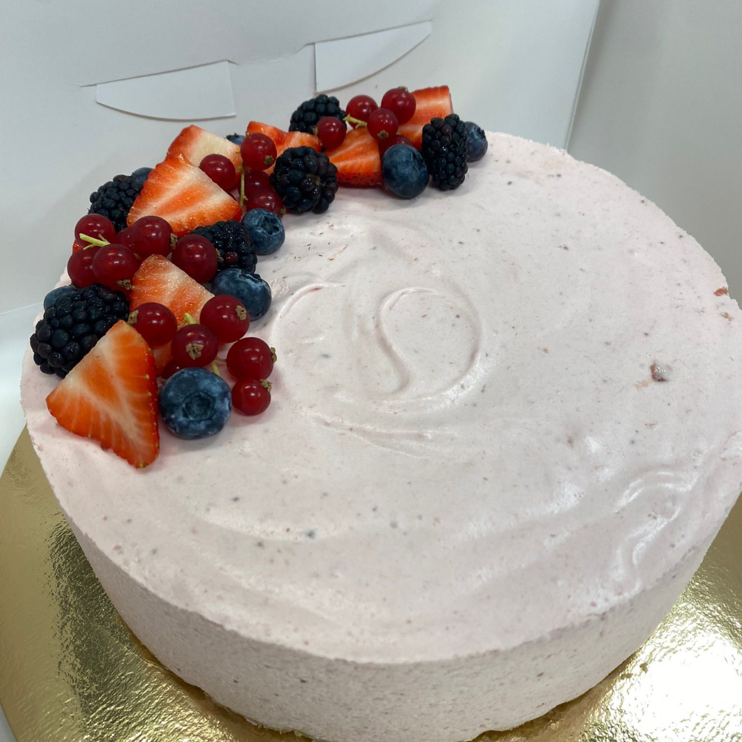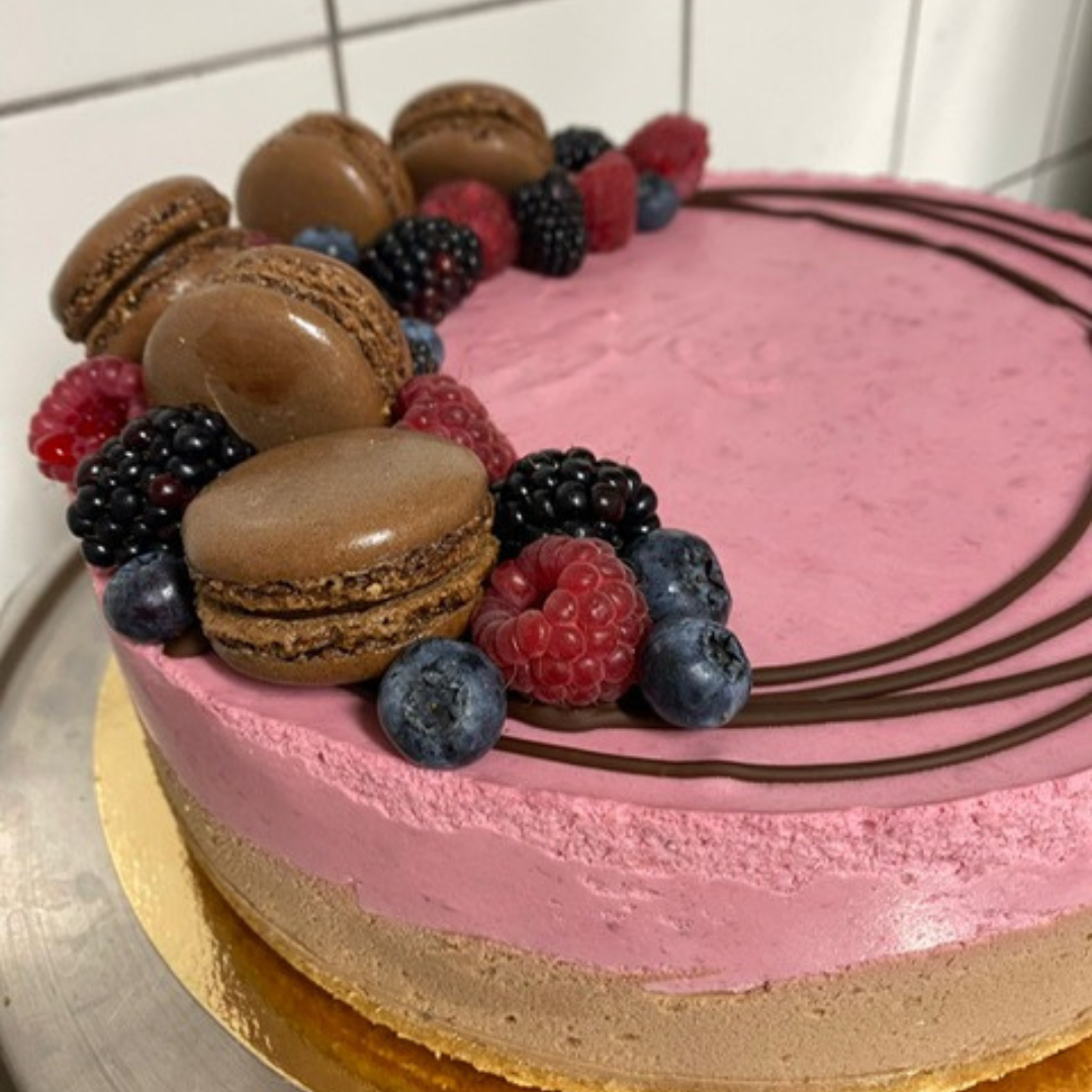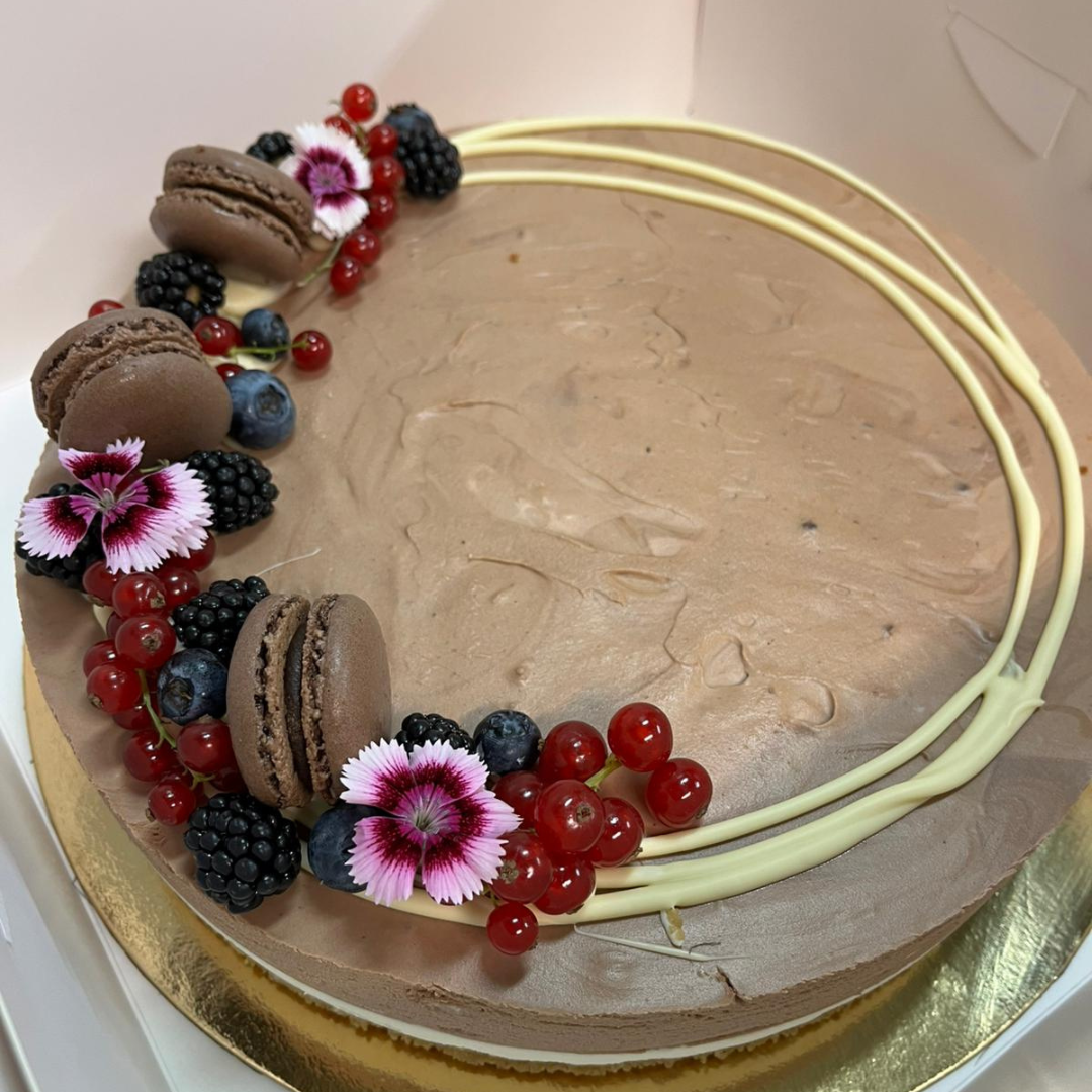 Kakku rakentuu rapealle keksipohjalle ja on täytetty valitsemillasi mauilla. Kakkuun sisältyy yksinkertainen, tyylikäs koristelu – esimerkiksi marjoja, macarons-leivoksia ja suklaata.