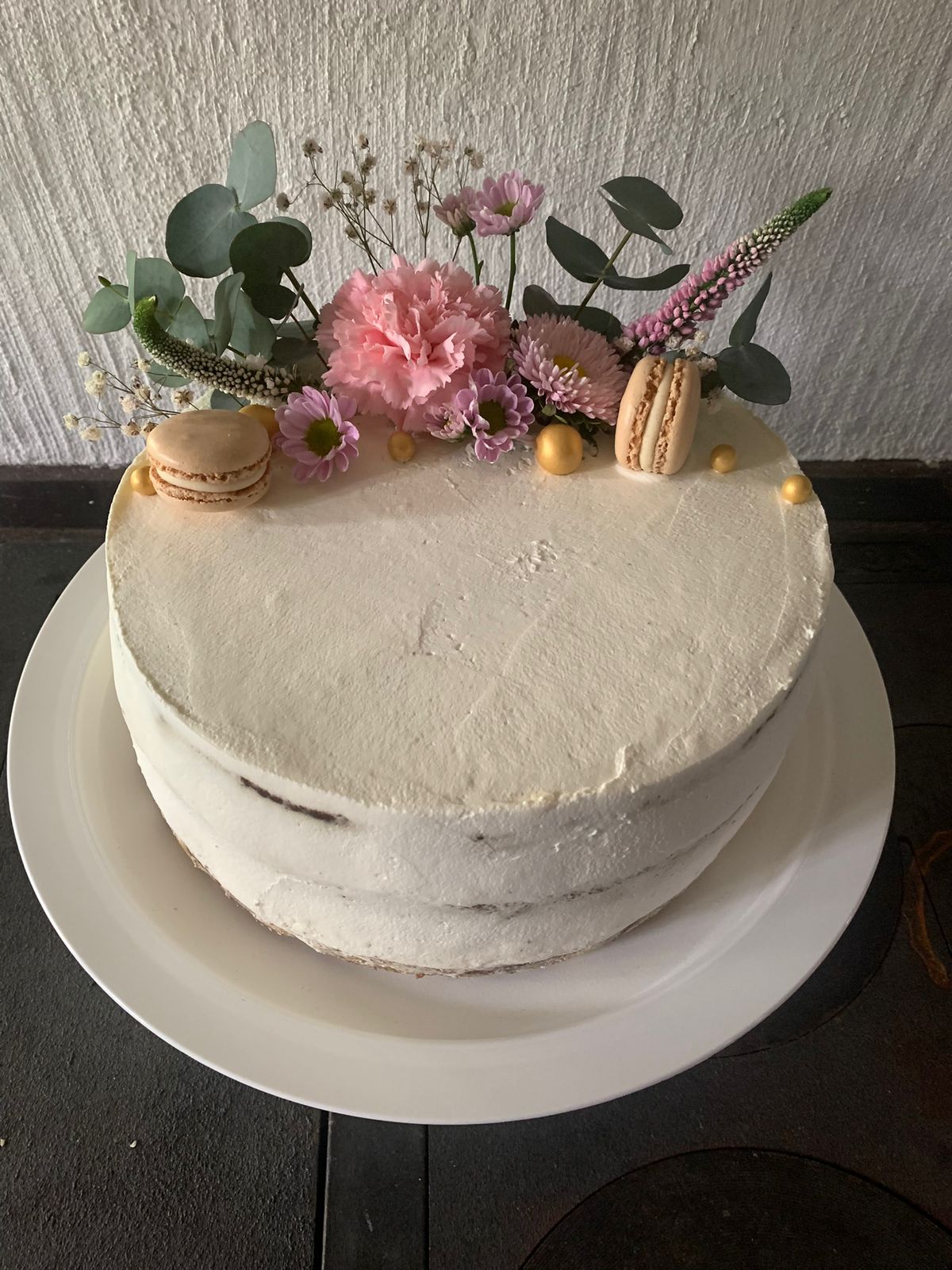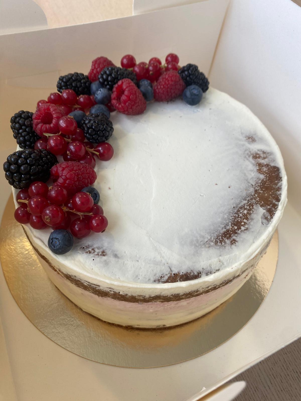 Moderni täytekakku tehdään vaaleaan kakkupohjaan ja viimeistellään tyylikkäällä, yksinkertaisella koristelulla – esimerkiksi marjoilla, macarons-leivoksilla ja suklaalla.